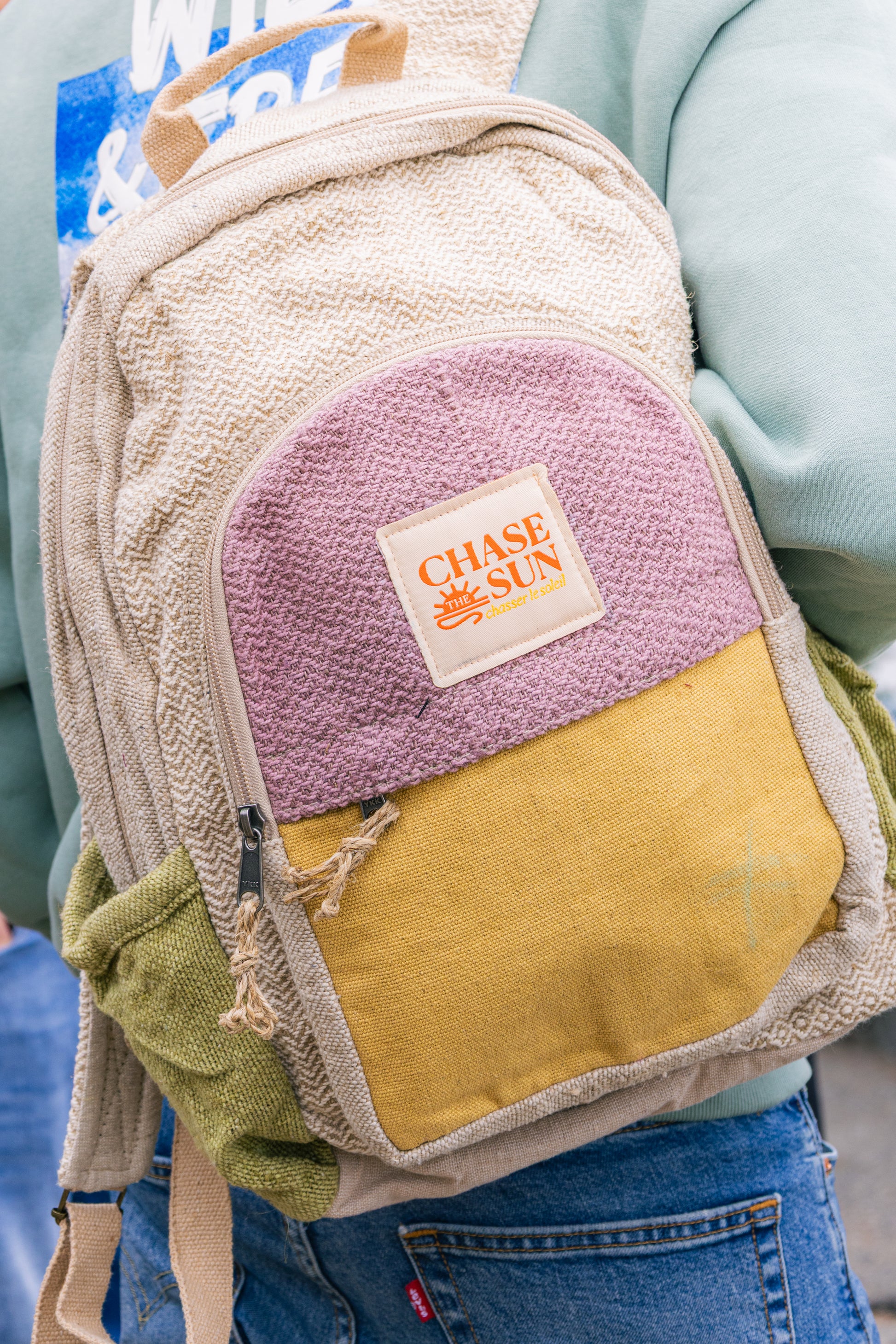 A playful hemp backpack in muted sunshine tones — made for light travelers and mood-lifters.